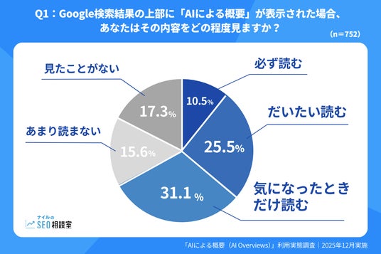 DX&マーケティング事業を展開するナイル株式会社(本社:東京都品川区、代表取締役社長:高橋飛翔、以下「ナイル」)は、全国の20~60代の男女752名を対象に、Google検索結果に表示される「AIによる概要(AI Overviews)」をどのように利用しているのかを調査。「AIによる概要」だけで検索行動は終了するのか、検索結果や参照サイト(リンク)を閲覧することはあるのかなどについて検証しました。