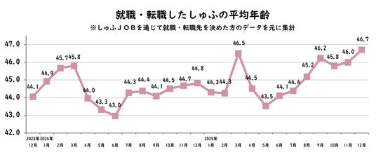 12月に平均年齢が上昇する傾向は、例年確認されています。年末は学校が冬休みに入ったり、帰省などが重なる時期であることから、しゅふ層、特に子育て世代にとって就職・転職活動に時間を割きにくい状況になりやすいと考えられます。