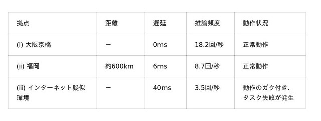 ロボットの推論処理は、カメラ映像を都度データセンターに送信し、処理結果を受け取る仕組みであるため、ネットワーク帯域と遅延が推論頻度(単位時間あたりの推論回数)に直接影響します。その結果、以下のような差異が確認されました。