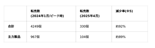データによると、サービス導入と並行した対策により、2025年1月を境に主要製品の転売数が大幅に減少。