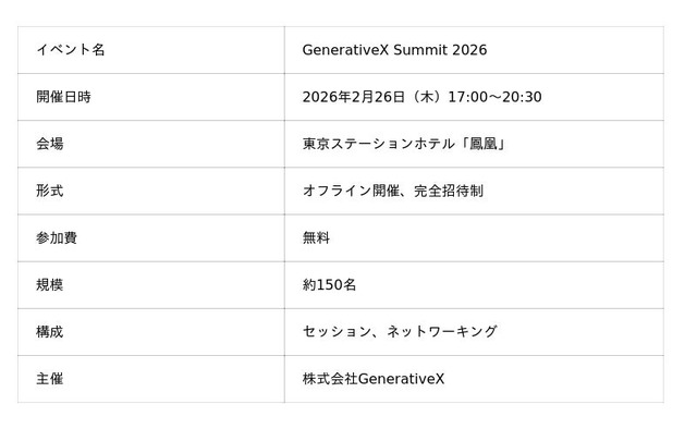 株式会社GenerativeX(本社:東京都千代田区、代表取締役CEO:荒木 れい、以下「当社」)は、生成AIの企業活用最前線に取り組む方々の情報交換とネットワーキングを目的とした完全招待制のカンファレンス「GenerativeX Summit 2026」を2026年2月26日(木)に東京ステーションホテルにて開催いたします。