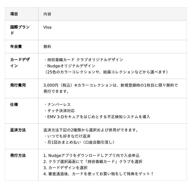 本カードは、日常の買い物を通じてアーティスト「持田香織」を応援できる仕組みで、カードの累計利用額に応じて本人が提供する限定特典や、オリジナルデザインカードをお楽しみいただけます。