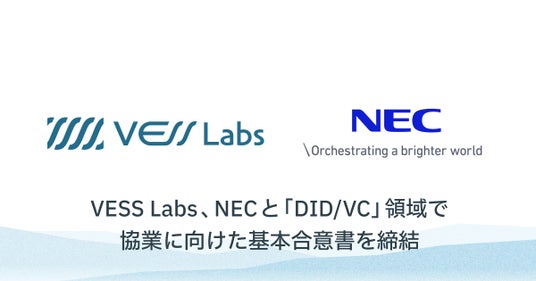 株式会社VESS Labs(ベスラボズ、以下、 VESS)と日本電気株式会社(以下、NEC)は、分散型ID技術(DID)と検証可能な証明書(VC)(以下 DID/VC)およびデジタルアイデンティティウォレット(以下 、DIW)に関する市場創出・拡大を目的とした基本合意書(MoU)を締結しました。