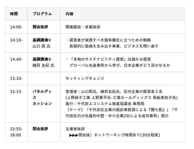 千代田区という都市の中心で、長期的に価値を生み出す、未来志向な社会(市場)をつくっていく中堅・中小企業の経営者に向けたセミナーを開催。山口周さん×磯貝友紀さん 共著「いまこそ、本物のサステナビリティ経営の話をしよう」の内容をベースに、区内の経営者たちも交えて語り合います。