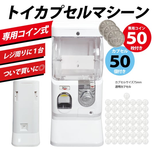 専用コイン専用機で、75mmの透明カプセル空カプセルが付属。