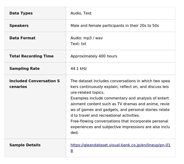 Visual Bank Inc. (Minato-ku, Tokyo; CEO: Saneyuki Nagai) has announced the release of a new dataset, “Japanese Two-Speaker Leisure-Themed Conversational Speech Corpus with Transcripts,” through its AI training data solution, Qlean Dataset, operated by its subsidiary, Amanai Images Inc.