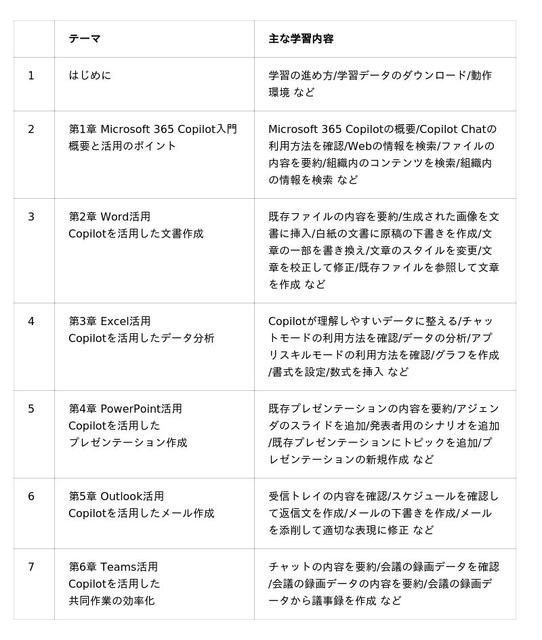 - 法人利用に特化した内容を学べる組織内のデータ検索やTeamsを活用した会議の議事録作成など、法人特有の活用スキルを習得できます。