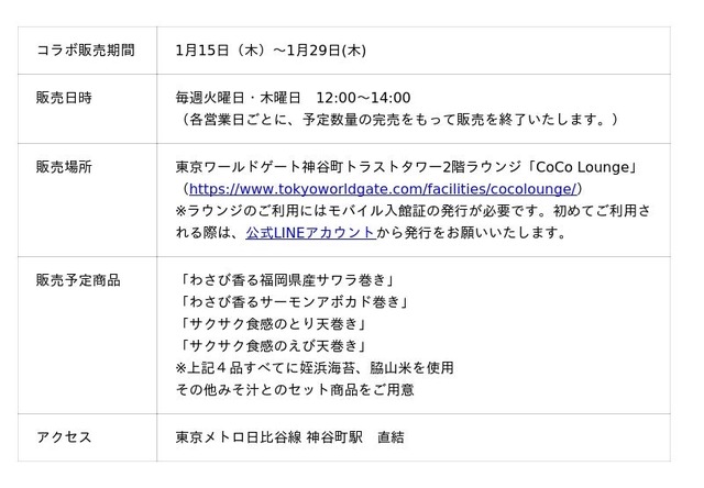 「CoCo JAPAN」は、日本各地の魅力ある食材や製品を都心から国内外へ発信する取り組みであり、本企画もその一環として実施されます。