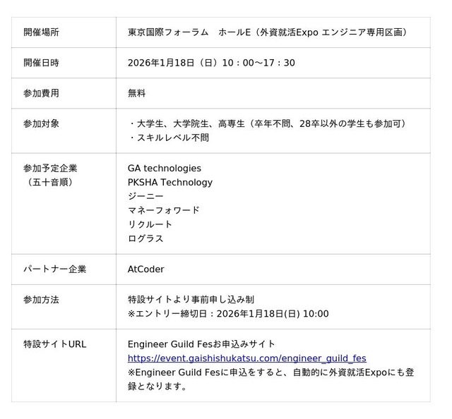 また、2025年(27卒)開催の外資就活Expoで新設した「エンジニアコーナー」もエリアを拡大し、世界最高峰の競技プログラミングコンテストサイト「AtCoder」と共同でエンジニアの未来をつくる文化祭「Engineer Guild Fes」を初開催いたします。本イベントでは、就活のみを目的とせずエンジニアリングに関わるあらゆる方々が一堂に会し交流するイベントとしています。当日はエンジニアリングの入門から最前線までを学ぶ「Talk Session」、初心者からご参加いただけるリアルタイム競技プログラミング大会の「Live Contest」、エンジニアコミュニティが集結する「Networking Space」の3コンテンツのほか、企業ブースやエンジニア就活講座を開催いたします。