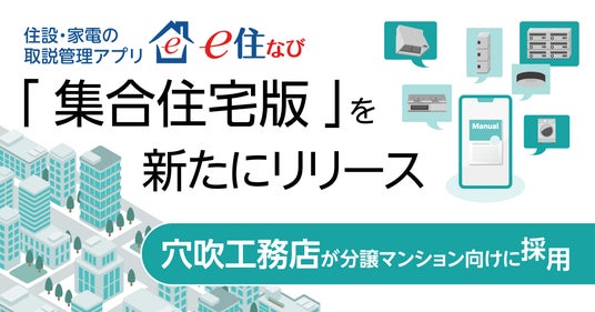 また、株式会社穴吹工務店(本社: 香川県高松市、代表取締役社長:竹本 勝/以下、穴吹工務店)が、分譲マンションの顧客向けとして、この集合住宅版アプリ「e住なび」、及び邸別住設建材管理システム/住設建材情報DBのクラウドサービス「HOUSING(ハウジング) eBASE Cloud」を採用しました。
