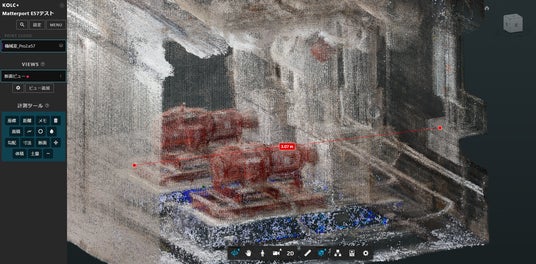 以下のスクリーンショットは、Matterport公式サイトで配布されているE57形式のサンプルファイルを、KOLC+の「統合アプリ」でプレビューした例です。断面を追加し、距離計測を行っています。BIM/CIMモデルとの重ね合わせは「位置合わせツール」で対応可能です。