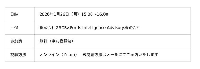 Fortis Intelligence Advisory株式会社(本社:東京都千代田区、代表取締役:稲村 悠、以下「FIA」)は、株式会社GRCS(以下「GRCS」)と共催し、2026年1月26日(月)15:00~16:00にオンラインセミナー「【1/26開催】ビッシング攻撃から組織を守る実践型"ボイスフィッシング訓練"」を開催いたします。参加費は無料(事前登録制)です。