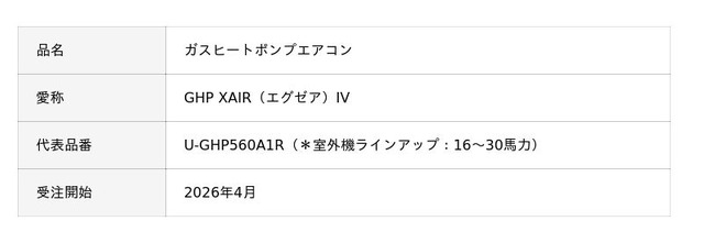 パナソニック株式会社 空質空調社(以下、パナソニック)は、ガスヒートポンプエアコンの超高効率タイプU形「GHP XAIR(エグゼア)III」の次世代機として、16馬力から30馬力のラインアップにおいて、マイクロチャネル熱交換器の採用によりAPFp(※1)2.20以上の高い省エネ性を実現するとともに、R32冷媒、e-メタン(※2)への対応で環境負荷を軽減したA1形「GHP XAIR(エグゼア)IV(本製品)」(※3)の受注を2026年4月から開始します。あわせて、8馬力から13馬力のラインアップで同じくR32冷媒対応機種、リニューアル専用機としてR410A冷媒対応の機種を8馬力から30馬力のラインアップで受注開始します。