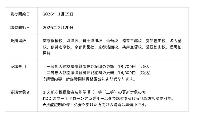 このたび、KDDIスマートドローンが提供するドローンスクール「KDDIスマートドローンアカデミー」において、東京板橋校をはじめとする13校(順次拡大予定)にて、更新講習を提供します。地域で安心安全な運航を担う操縦者をサポートするため、全国各地に展開するKDDIスマートドローンアカデミーのネットワークを活かし、お近くの実施校にて随時、受講申込を受け付けます。
