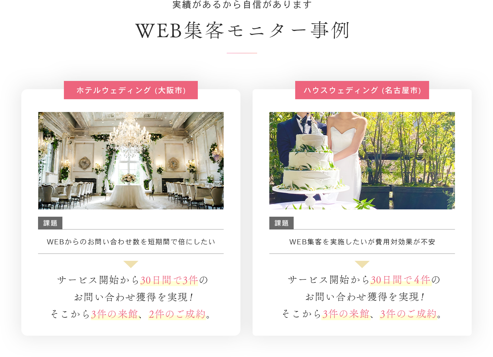 また、これまで全国で120以上の結婚式場の集客支援を行ってきた知見を活かすことで成果報酬型のサービスを実現しています。