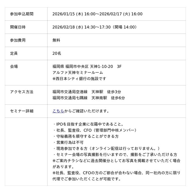 - 第1部 IPOの魅力と「福証」という戦略的選択(14:30~15:15)- 第2部 結果を出すための「内部管理体制」の設計(~16:00)