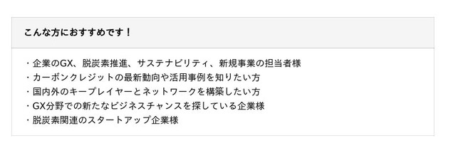 Green Carbon株式会社、国立研究開発法人宇宙航空研究開発機構(JAXA)、大阪ガス株式会社、デロイト トーマツ ベンチャーサポート株式会社、Gold Standard、Verra、兼松株式会社、農林中央金庫、株式会社ファミリーマート、日本農業新聞、株式会社イトーキ、KPMGコンサルティング株式会社、ジクシス株式会社、住友林業株式会社、環境ビジネスオンライン、株式会社東京証券取引所、三菱UFJリサーチ&コンサルティング株式会社、株式会社野村総合研究所(NRI)、株式会社セールスフォース・ジャパン、ボストン・コンサルティング・グループ(BCG)、出光興産株式会社、住友商事株式会社、三菱UFJ信託銀行株式会社、日本経済新聞、株式会社Archeda、Earth hacks株式会社、株式会社バイウィル、株式会社aora※カーボンクレジット領域の大手企業、自治体、省庁関連、スタートアップが登壇します。追って情報を記載します。