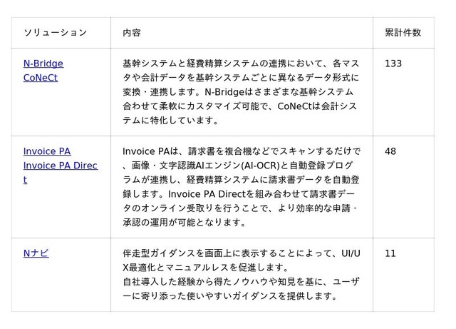 「N-Bridge」、「CoNeCt」、「Invoice PA」、「Invoice PA Direct」、「Nナビ」など、経費精算業務の最適化と効率化を促進するこれらのソリューションは、申請業務や支払業務における効率化などに役立ち、お客さまに大変ご好評いただいております。