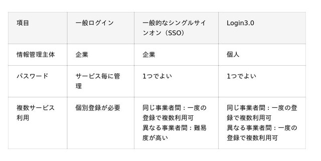 Login3.0は一般的なシングルサインオン(SSO)※3と同等の安全性・利便性を持ち、安全性・利便性双方の観点で一般ログインより優位。さらにLogin3.0は、一般的なSSOと異なり、事業者を跨いだ複数サービス利用も可能。