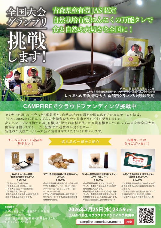青森県の自然栽培農家と食品事業者による共同体「チーム 勝ち上がれ青森2025!」が、2月28日に開催される「にっぽんの宝物JAPAN大会2025-2026」に出場し、有機JAS認証を受けた自然栽培有機にんにくを使用した万能タレを出品することを発表しました。