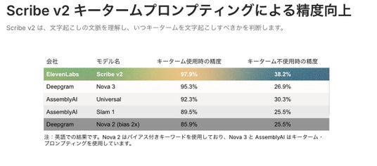 1)業界最高水準の精度:日本語を含む多言語で圧倒的な「低WER(単語誤り率)」を記録Scribe V2は、業界標準ベンチマークにおいて最低水準のWER(単語誤り率)を記録しました。特に日本語モデルにおいても、他社主要モデルを凌駕する高い認識精度を実証。字幕・キャプション・記録用途で求められる「手直しを大幅に削減した書き起こし」を実現します。