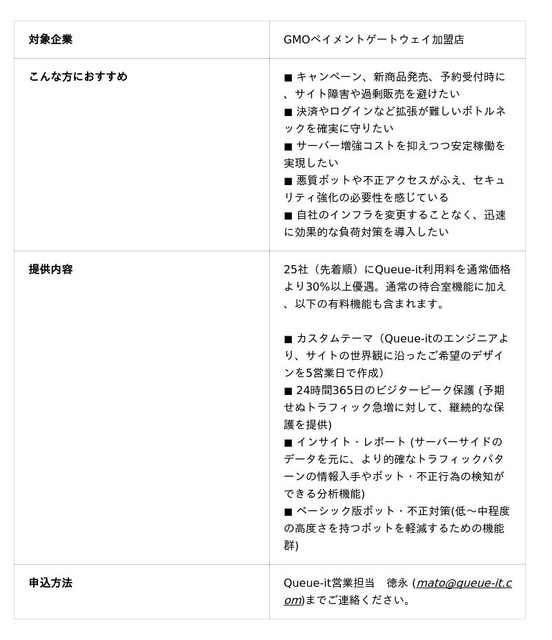 GMOペイメントゲートウェイは、国内トップクラスの決済プラットフォームを運営し、加盟店の収益最大化とセキュアな決済環境の提供を推進してきました。今回のパートナーシップにより、GMOペイメントゲートウェイの決済プラットフォームを利用する加盟店に対して、Queue-itのトラフィック制御技術を提供することで、急増するオンライン取引における「安定稼働」「公平なユーザー体験」「セキュリティ強化」を同時に実現していきます。