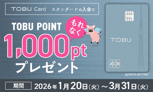 キャンペーン期間中(2026年1月20日 ~ 3月31日)に東武カード(スタンダード)へ申込の上、カードが発行された方にTOBU POINT1,000ポイントをプレゼントいたします!