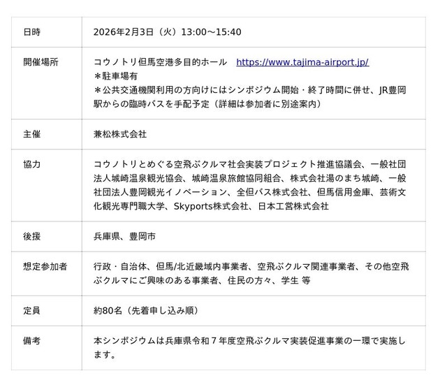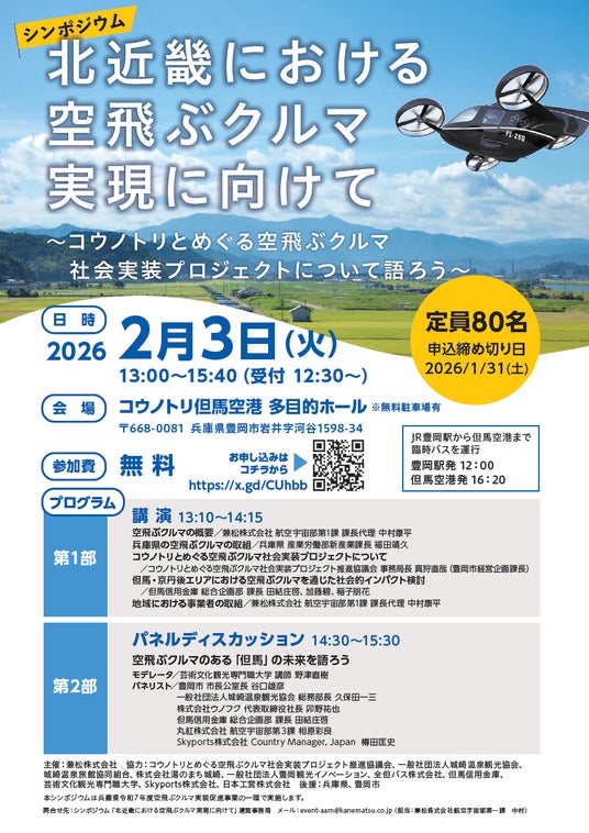 本シンポジウムを通じて、空飛ぶクルマに関する最新動向、但馬・北近畿地域における空飛ぶクルマの社会実装の可能性、地域における社会的インパクトについて、皆さまとともに考える機会となれば幸いです。