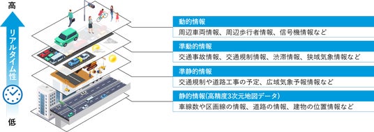 総務省の事業の中で、当社はダイナミックマップデータを受信して可視化するアプリケーションの構築、実証および有効性評価を実施しています。ダイナミックマップデータとは、ダイナミックマッププラットフォームが有する高精度3次元地図データ(静的情報)と、安心・安全な自動運転をサポートするための様々な情報(動的情報)を重ね合わせたものです。