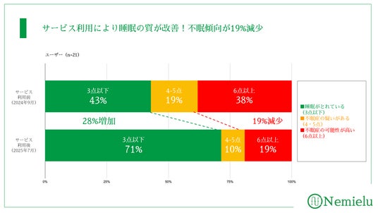 ・ユーザーのサービス利用前後※5に取得したアテネ不眠尺度※6の点数を比較した結果、「睡眠がとれている(3点以下)」の割合が28%増加、「不眠症の可能性が高い(6点以上)」の割合が19%減少し、睡眠の改善傾向が確認されました。