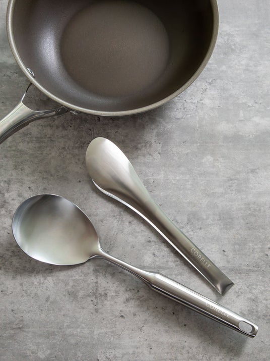 コレールフライパンと合わせて使うことを前提とした、スタイリッシュなデザインの万能調理スプーンとトングの2点セットです。調理から盛り付けまで、さまざまなシーンで活躍します。