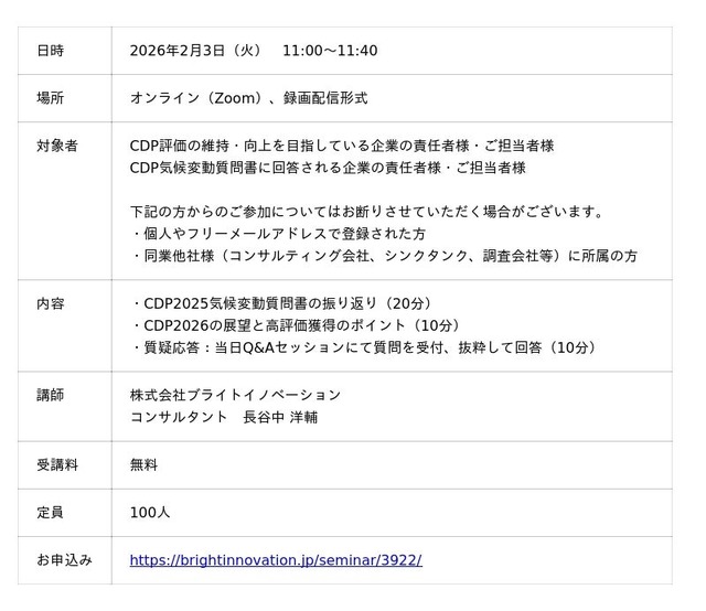 エンビプログループの株式会社ブライトイノベーション(本社:東京都中央区、代表取締役社長:荻巣 和紀、以下「当社」)は、CDP評価の維持・向上を目指している企業の責任者様・ご担当者様、またはCDP気候変動質問書に回答される企業の責任者様・ご担当者様向けに、気候変動質問におけるCDP2025総括とCDP2026質問書の展望について無料ウェビナーを開催します。