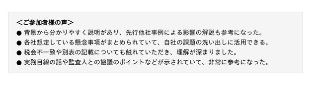 経理担当者から寄せられる実務上の疑問について、ライブ配信でリアルタイムに回答し、対応を進める上での不安を解消します。
