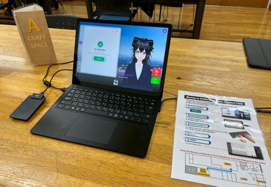 エントランスでは、受付AIエージェントRINが多言語で案内