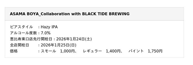 株式会社ワンダーテーブル(本社:東京都新宿区、代表取締役社長:河野博明)は、よなよなエール公式ビアレストラン「よなよなビアワークス」にて、株式会社ヤッホーブルーイング(本社:長野県軽井沢町)と宮城県気仙沼市のクラフトブルワリー「BLACK TIDE BREWING」が共同で醸造したコラボレーションビール「ASAMA BOYA_Collaboration with BLACK TIDE BREWING」を、数量限定で提供開始します。
