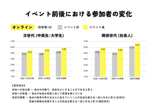事前・事後アンケートの結果、次の3項目で、世代を問わずポジティブな変化が見られました。- 社会への効力感:自分の行動が社会を変えられるという感覚