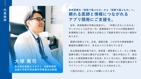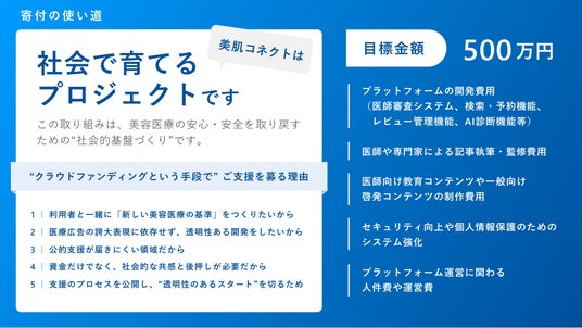 株式会社美肌AIコネクト(代表取締役:大塚篤司、以下「当社」)は、AIと専門医の知見を組み合わせた美容医療の透明評価プラットフォーム「美肌コネクト」の開発資金を募るクラウドファンディングを開始することをお知らせいたします。今回のクラウドファンディングは、期間が1月20日20時~3月31日(70日間)、目標金額は500万円(All-in型)です。