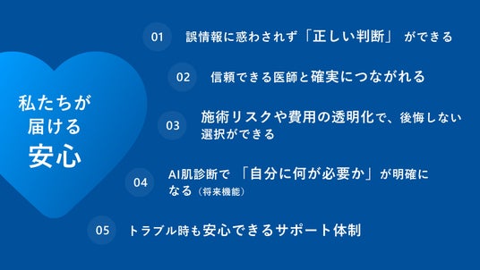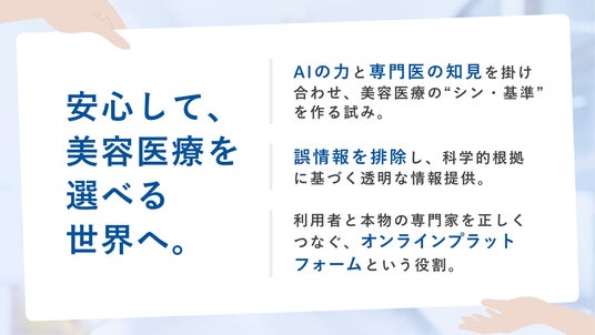こうした状況が続けば、経験豊富な医師が評価されず、価格や広告に惑わされた選択が主流となり、利用者の安全が損なわれるおそれがあります。私たちはAIと専門医の力で誤情報を排除し、科学的根拠に基づいた透明な情報を提供することで、安心して美容医療を選べる社会を実現したいと考えています。