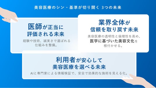 この“シン・基準”によって、経験や技術・誠実さで医師が選ばれる未来、業界全体が医学に基づいた美容文化を取り戻す未来、そして利用者が安心して美容医療を選べる未来を目指します。