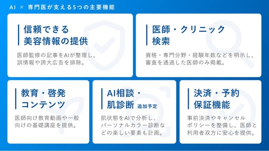 医師の資格や専門分野、臨床経験年数などを第三者の有識者が審査し、一定の基準を満たした医師のみを掲載します。利用者は悩みや施術、医師名、クリニック名から検索して予約でき、施術の解説や注意点も確認できます。