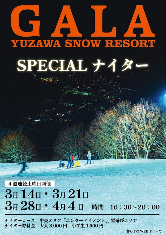 GALA湯沢では夜時間帯を活用した新たな価値創出と地域課題解決を目的に、4日間期間限定のナイター営業を行います。1996年以降ナイター営業を実施しておりませんでしたが、昨年のトライアルを経て実に30年ぶりに復活させます!