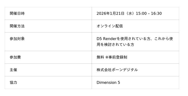 本セミナーでは、バージョン3.0で追加された新機能や強化されたワークフロー、そして改めて注目される「ルームツアー機能」について、デモンストレーションを交えながらわかりやすく解説します。すでにD5 Renderをご利用中の方はもちろん、これから導入を検討されている方にもおすすめの内容です。ぜひお気軽にご参加ください。