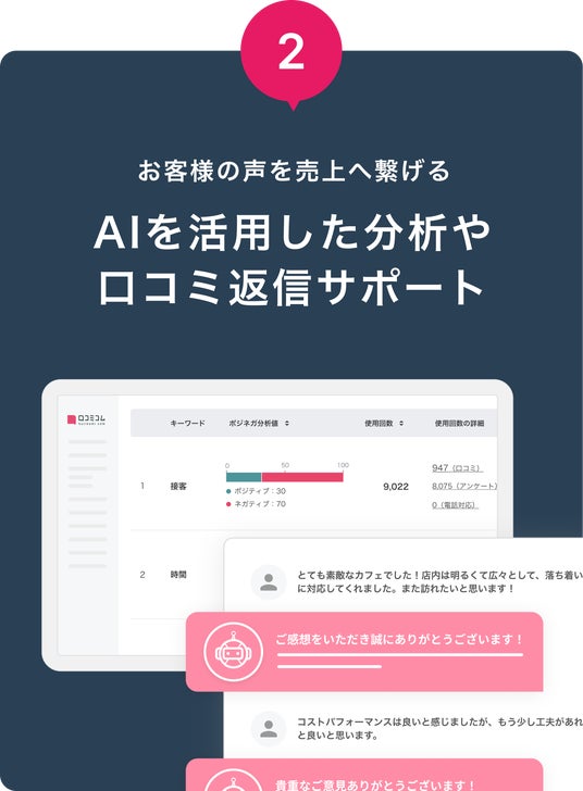 口コミを一元管理!AIが分析・返信をサポート集約した口コミやアンケートをAIが解析・スコア化することで、分析の難しいお客様の声を様々な軸で定量的に分析し、経営判断や店舗改善に役立てることができます。また、口コミの返信もAIがサポートするので、お客様との円滑なコミュニケーションも実現します。