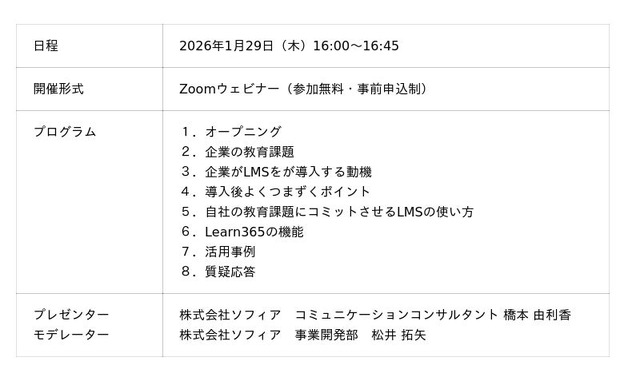 本セミナーでは、基礎研修のみではカバーできない内発的動機づけによって生じる学習格差の問題を整理し、改めて企業がLMSを導入しどのように活用していくべきかをディスカッションします。