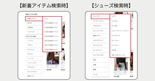 「新着アイテム」や「シューズ」といったカテゴリに加え、より細分化された項目が検索条件として表示されるようになりました。この機能によってユーザーは少ない操作で効率よく商品を探すことが可能となるため、快適な購買体験の実現をサポートしています。