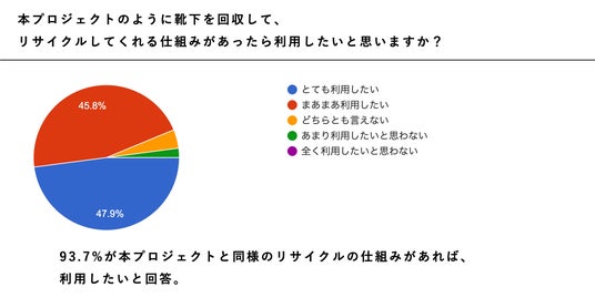 回収された靴下の購入意向については、「通常商品と同程度」「通常商品より安価」であれば購入したいと回答した人が計 87.5%を占めており、コストを市場ニーズに合わせることで、リサイクル製品としての受容性を高められる可能性が示されました。