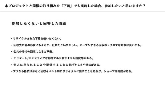 一方で回収品目を「肌着」や「下着」に拡大した場合には参加意向が低下し、とくに「下着」では 29.2% が参加に消極的と回答しました。「靴下」に比べ、心理的な抵抗が大きいことが課題として浮き彫りになりました。