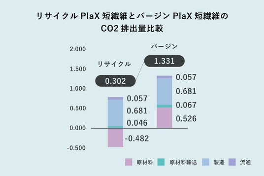 ・ポリエステルと比較して、PlaX に置き換えることで、長繊維の製造にかかる CO2排出量を70%削減、短繊維(原綿)の製造にかかる CO2 排出量を50%削減。