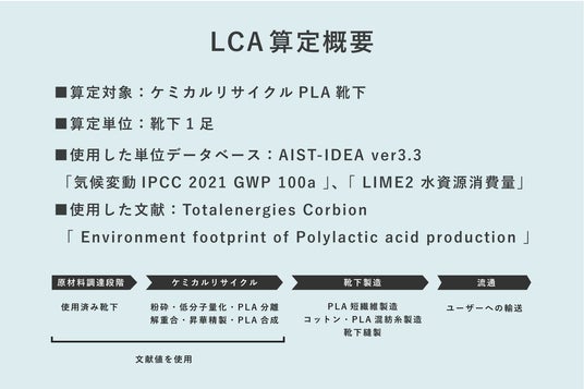 本実証実験では、汚れなどが付着した使用済み靴下であっても、ケミカルリサイクルにより原料であるポリ乳酸へ再生できるかを検証しました。なお、本実証は靴下などの製品化までを行うものではなく、原料であるポリ乳酸の生成までを検証対象としています。