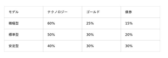 たとえば、積極型で運用していて、テクノロジーが60%から50%に下落した場合、ゴールドと債券の一部を売却し、テクノロジーファンドを購入します。これによりポートフォリオ配分を積極型に調整します。